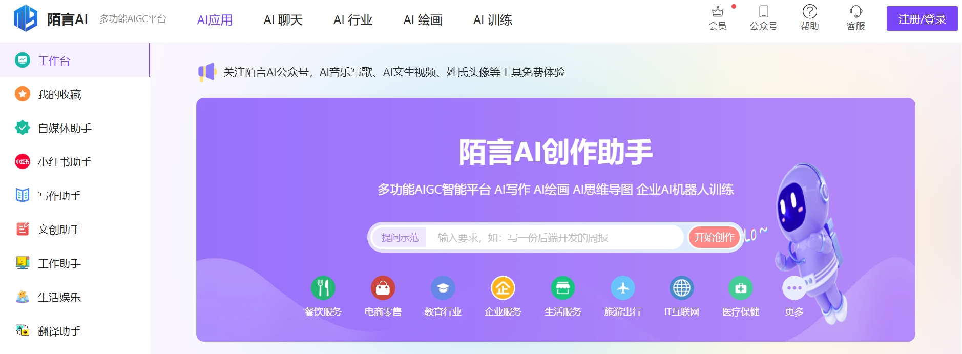 陌言AI致力于通过其多功能AIGC平台,为用户提供一个全面、便捷、高效的智能创作环境,释放创意潜力,提升工作效率。