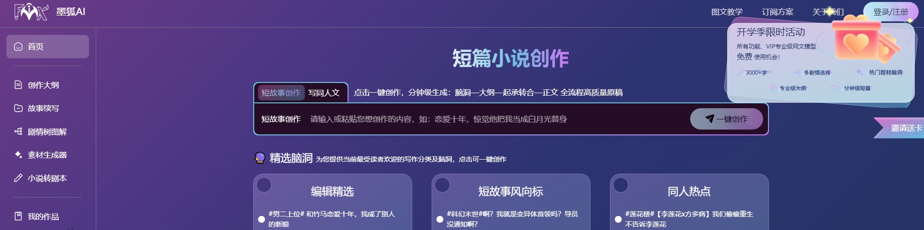 墨狐AI是一个专注于短篇小说创作的人工智能平台,它提供了一系列工具来帮助用户快速生成高质量的原稿。
